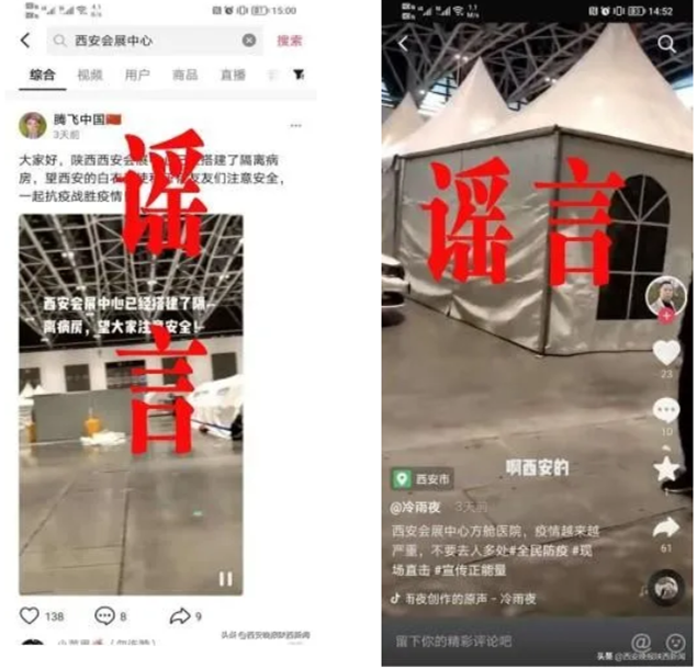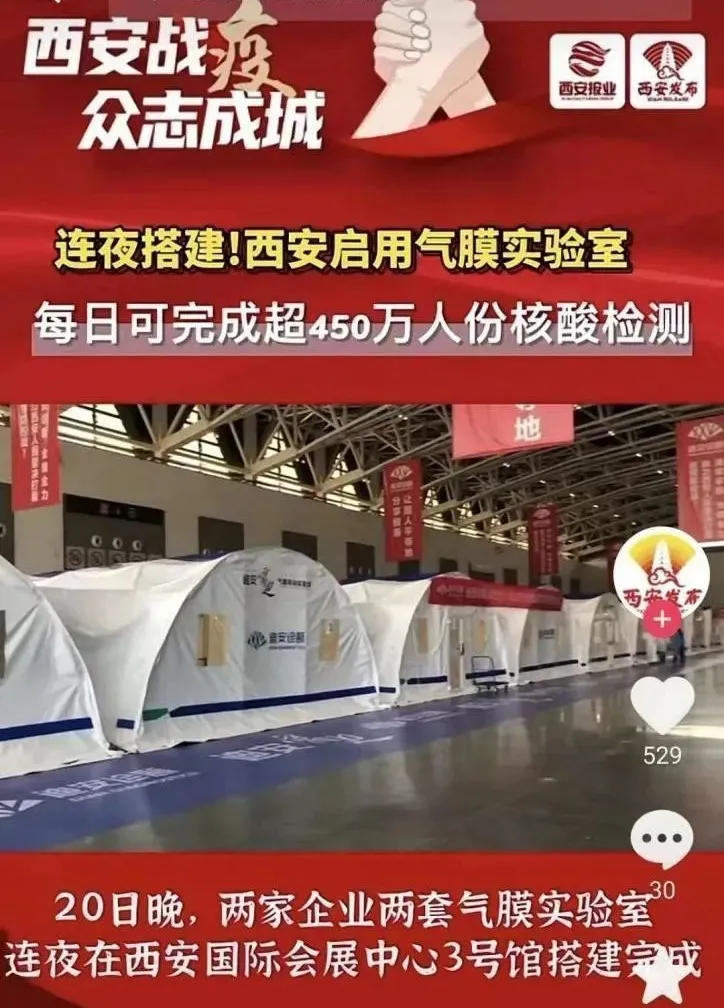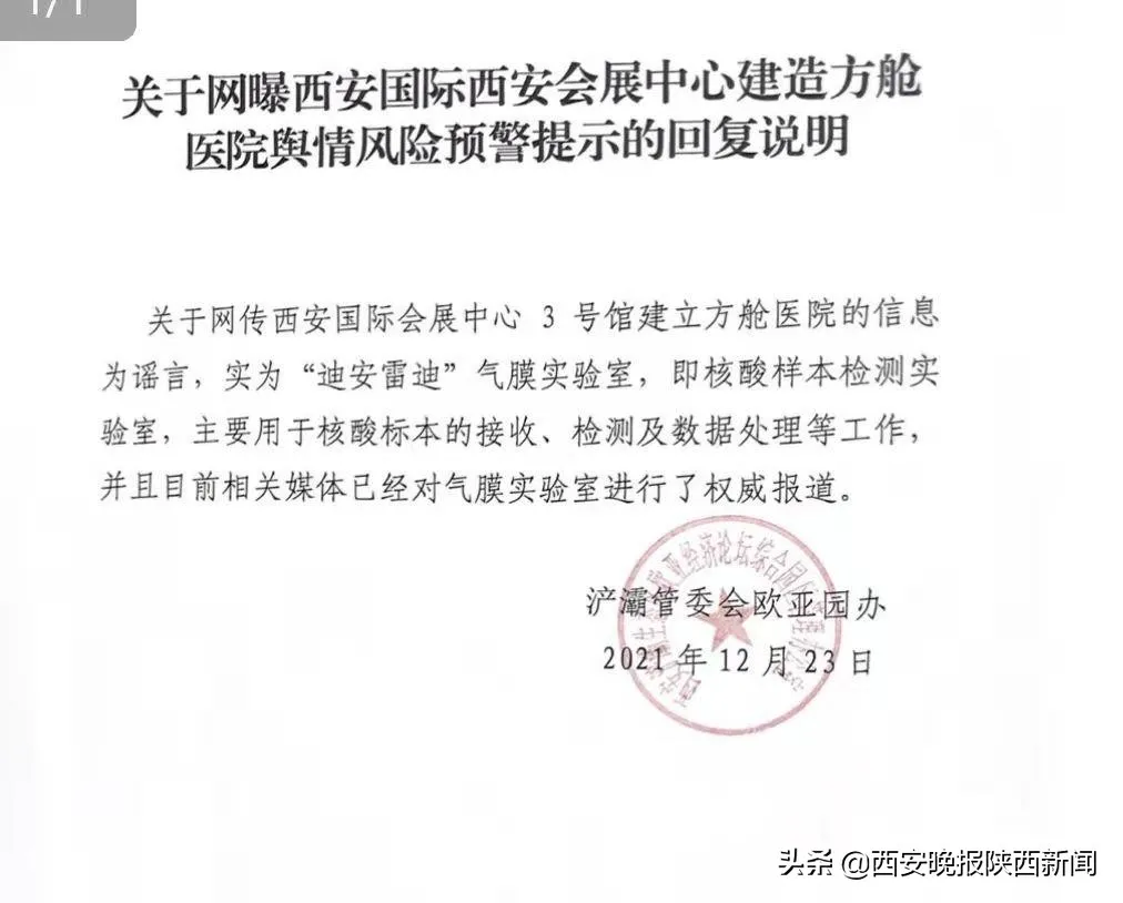 近日,短視頻平臺(tái)有網(wǎng)民發(fā)視頻稱“西安國(guó)際會(huì)展中心正在建方艙醫(yī)院”,經(jīng)核實(shí),該信息為謠言,實(shí)為“迪安雷迪”氣膜實(shí)驗(yàn)室,用于核酸檢測(cè)工作。