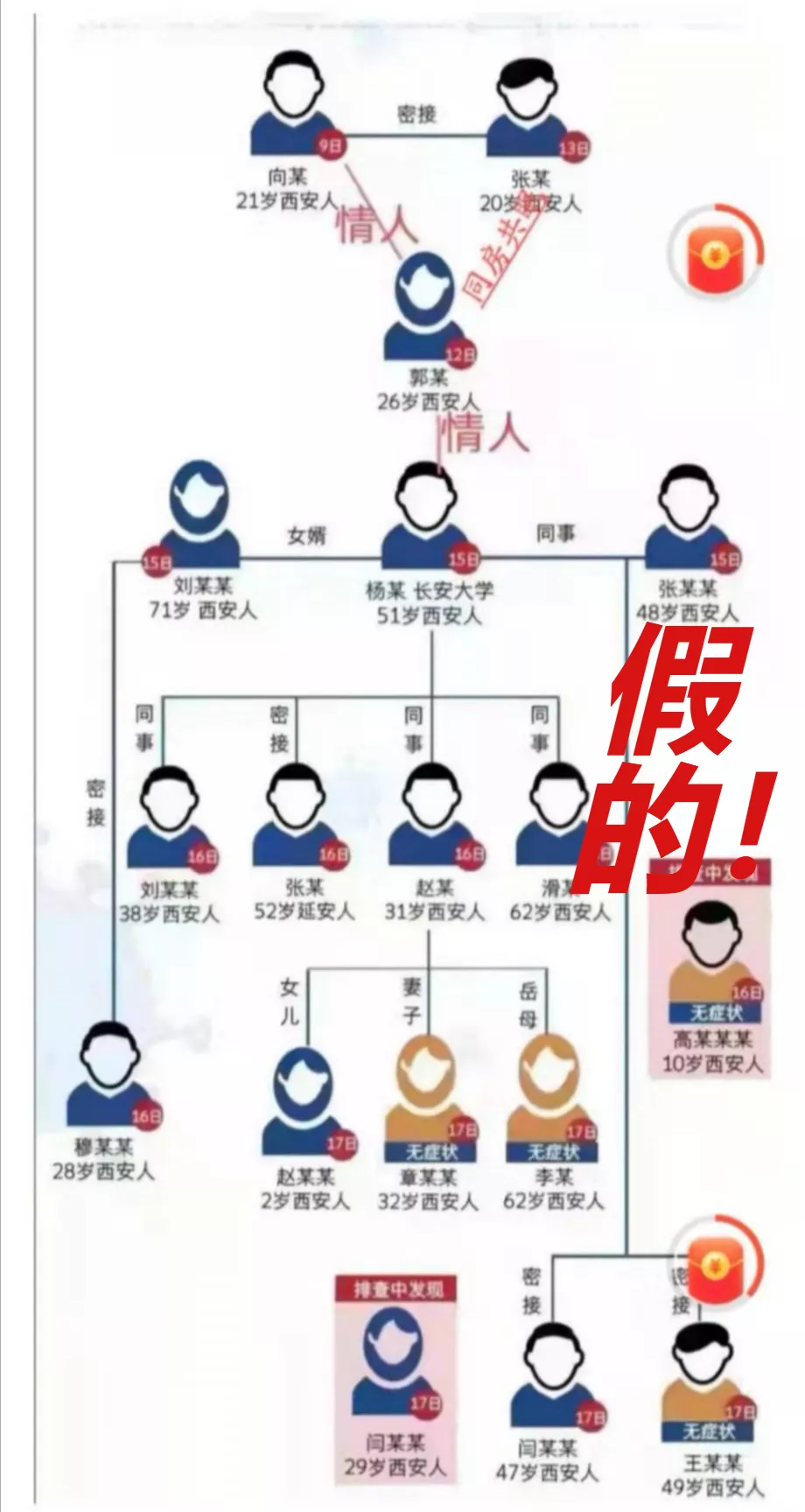 網(wǎng)上流傳一張確認(rèn)病例傳播鏈分解圖,在病例之間標(biāo)注“情人”關(guān)系,并傳言此次疫情傳播因素之一,是因?yàn)槲靼彩桌±c子牛門(mén)診的護(hù)士為情人關(guān)系,導(dǎo)致疫情擴(kuò)散,經(jīng)核實(shí),該圖盜用華商網(wǎng)12月18日制作的新聞作品圖片。該信息為虛假信息,造謠的人已被拘留。