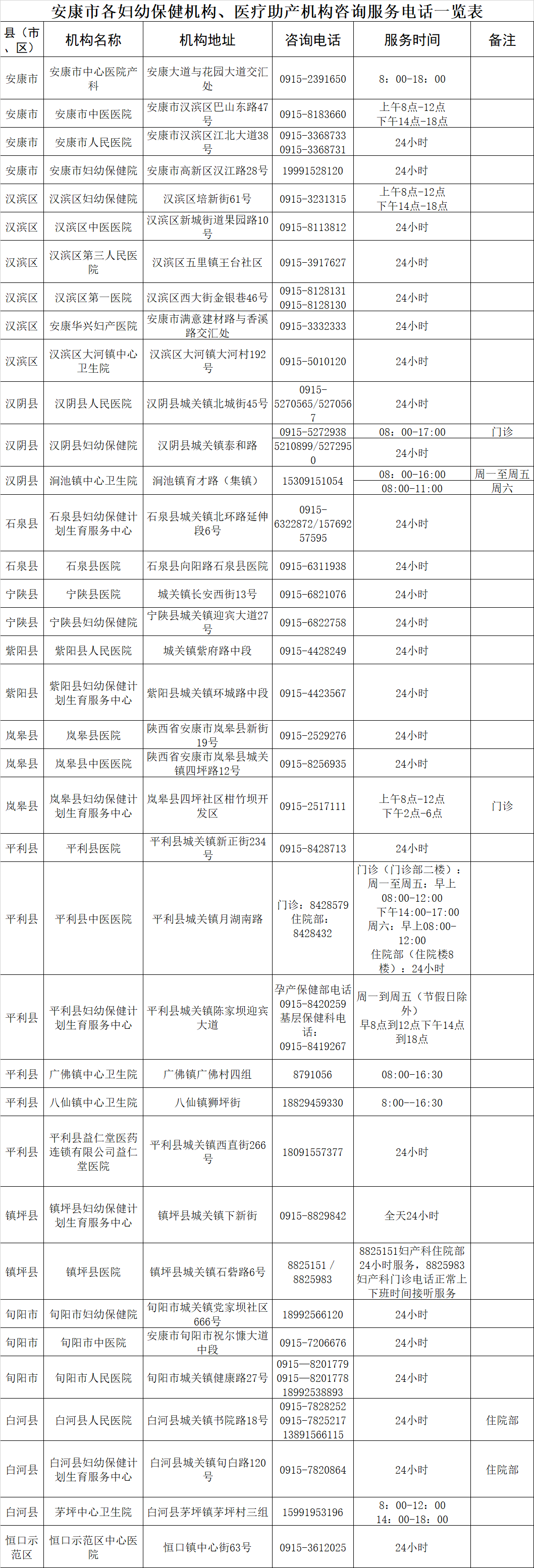 安康市各婦幼保健機(jī)構(gòu)、醫(yī)療助產(chǎn)機(jī)構(gòu)咨詢(xún)服務(wù)電話