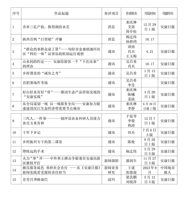 經(jīng)過1月30日編委會推薦、社黨委研究決定,擬推薦以下15件新聞作品參評2023年度“陜西新聞獎”。公示時(shí)間從2024年3月6日至2024年3月12日,公示期為5個工作日。如有不同意見,請向安康日報(bào)社機(jī)關(guān)紀(jì)委、新聞管理部反映。