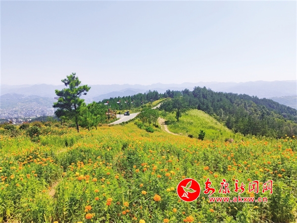 現(xiàn)在的牛蹄嶺已然成了安康城區(qū)市民休閑納涼的好去處,特別是下午夕陽西下時,大量人群涌入到牛蹄嶺景區(qū),在興賢塔向東一百米左右,穿過彩虹柏油路便可抵達一大片萬壽菊競相綻放的花海,花團錦簇的場景引得路人駐足觀賞、打卡留影。徜徉在花海、藍天、白云、微風(fēng)、蟲鳴組合而成的風(fēng)景里,身心都倍感愉悅。在這里不僅可以看到花海,站在觀景臺遠眺,安康城區(qū)的景色也可一覽無余。待到夕陽西下時,與夕陽、花海合影留念,頗有“滿城盡帶黃金甲”之感。