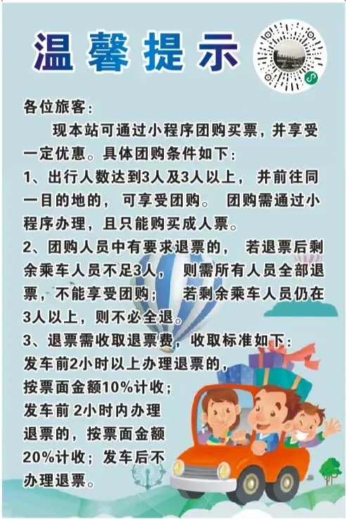 新增團(tuán)購(gòu)小程序,目前開(kāi)啟安康——紫陽(yáng)團(tuán)購(gòu)票,紫陽(yáng)全程68公里,途經(jīng)包茂高速,運(yùn)行大約1小時(shí)。票價(jià)最低20元起,三人可成團(tuán),購(gòu)票更優(yōu)惠!下方圖片內(nèi)二維碼可快速購(gòu)買(mǎi)。