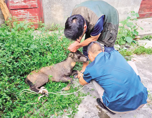 有著多次救助野生動物經(jīng)驗的八仙保護站站長鄒奎兵,一邊安撫驚恐不安的野羊,一邊聯(lián)系當?shù)孬F醫(yī)準備救治。針劑急救,傷口處理,很快就緒,并臨時安置在千家坪林場廢棄的場院中。