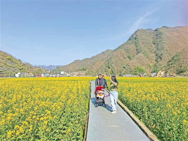春暖花開(kāi),旬陽(yáng)市仁河口鎮(zhèn)水泉坪千畝油菜花海競(jìng)相綻放,慕名而來(lái)的游客們?cè)谟^光步道上觀光散步,三五伙伴一起拍照打卡、合唱民歌,欣賞高山出平川的獨(dú)特自然風(fēng)光。