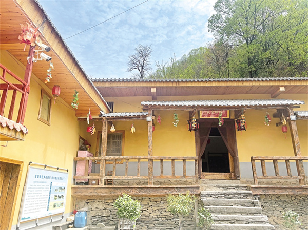 藍(lán)天、白云、清風(fēng)、朗日、松林……一切慵懶舒適得剛剛好。一路盤繞,繞道幾彎桃紅柳綠、野花盛開的山道,掠過桃紅李白郁郁蔥蔥的樹林,周家院子便毫無征兆地映入眼簾。隔墻遠(yuǎn)瞧,院內(nèi)房屋呈L形鋪展開來,房梁上懸掛的金黃色玉米穗、燦若紅霞的辣椒展示著農(nóng)家物產(chǎn)豐饒的鄉(xiāng)野特色,犁彎、犁脖、犁鏵,述說著院子主人的勤勞與殷實。而一串串醒目的大紅燈籠,展示著主人的幸福生活和對未來的美好憧憬。