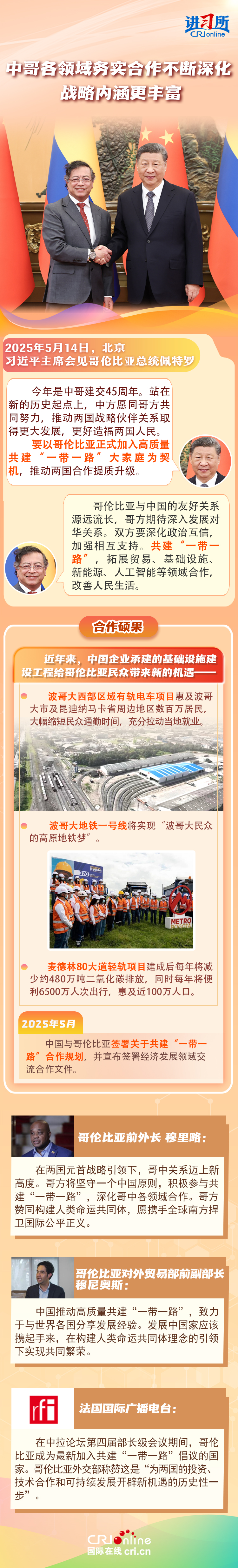 習(xí)近平主席在這三場(chǎng)雙邊外事活動(dòng)中,均提到了共建“一帶一路”倡議:“深化‘一帶一路’倡議同巴西發(fā)展戰(zhàn)略有效對(duì)接”“要以哥倫比亞正式加入高質(zhì)量共建‘一帶一路’大家庭為契機(jī),推動(dòng)兩國(guó)合作提質(zhì)升級(jí)”“雙方要落實(shí)好共建‘一帶一路’合作規(guī)劃”……10多年來(lái),在習(xí)近平主席親自擘畫(huà)和推動(dòng)下,共建“一帶一路”從中國(guó)倡議走向國(guó)際實(shí)踐,取得了實(shí)打?qū)?、沉甸甸的成就?/p>