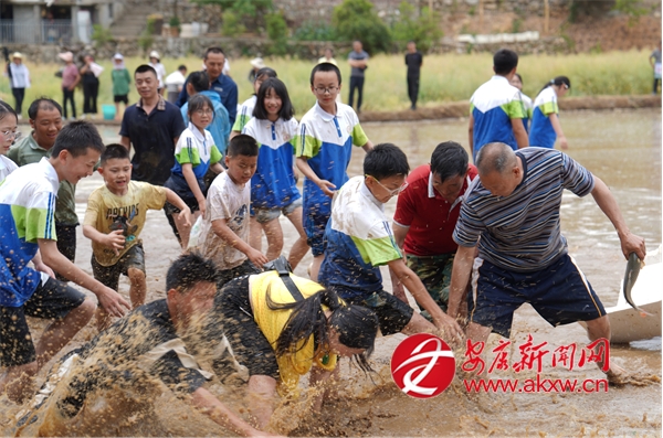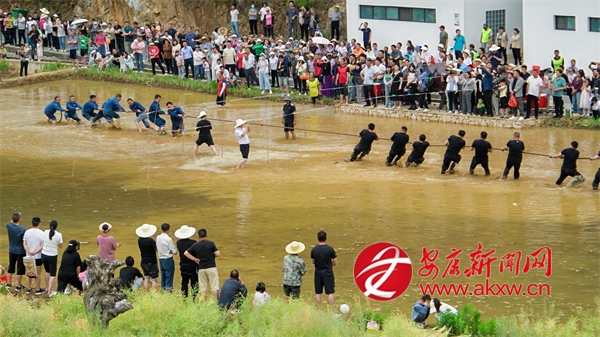 插秧比賽后緊接著開(kāi)展了拔河比賽,參賽者們光著腳在泥濘的田里奮力拉扯,你來(lái)我往,互不相讓,田邊的觀眾則奮力地為自己支持的隊(duì)伍加油鼓勁。稻田抓鴨捕魚(yú)活動(dòng)讓現(xiàn)場(chǎng)氣氛更加熱烈,觀眾紛紛脫下鞋襪,卷起褲腿,在稻田中追逐游魚(yú)和鴨子,歡快的笑聲此起彼伏。?