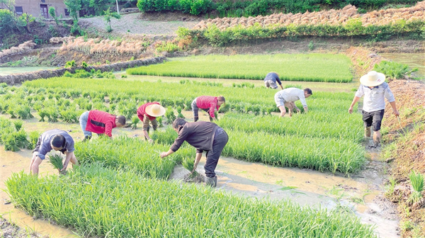 只見水田中村民們排成整齊的隊列,左手攥秧苗,右手飛快地從秧把中分出幾株,拇指與食指輕捻,穩(wěn)穩(wěn)插入泥中。彎腰、分苗、插秧,整套動作一氣呵成,不過兩三秒。濕潤的泥土裹挾著稻苗的清香,在插秧的節(jié)奏中升騰,勾勒出傳統(tǒng)農耕的詩意與韻律?!皠e看這插秧動作簡單,講究可不少。秧苗入土深度要適中,太淺容易漂,太深影響生長。”王嬸直起腰擦了把汗,褲腳沾滿泥漿卻笑得開懷,“這手藝都是祖輩傳下來的,我們種了一輩子地,只盼著秧苗茁壯成長。”