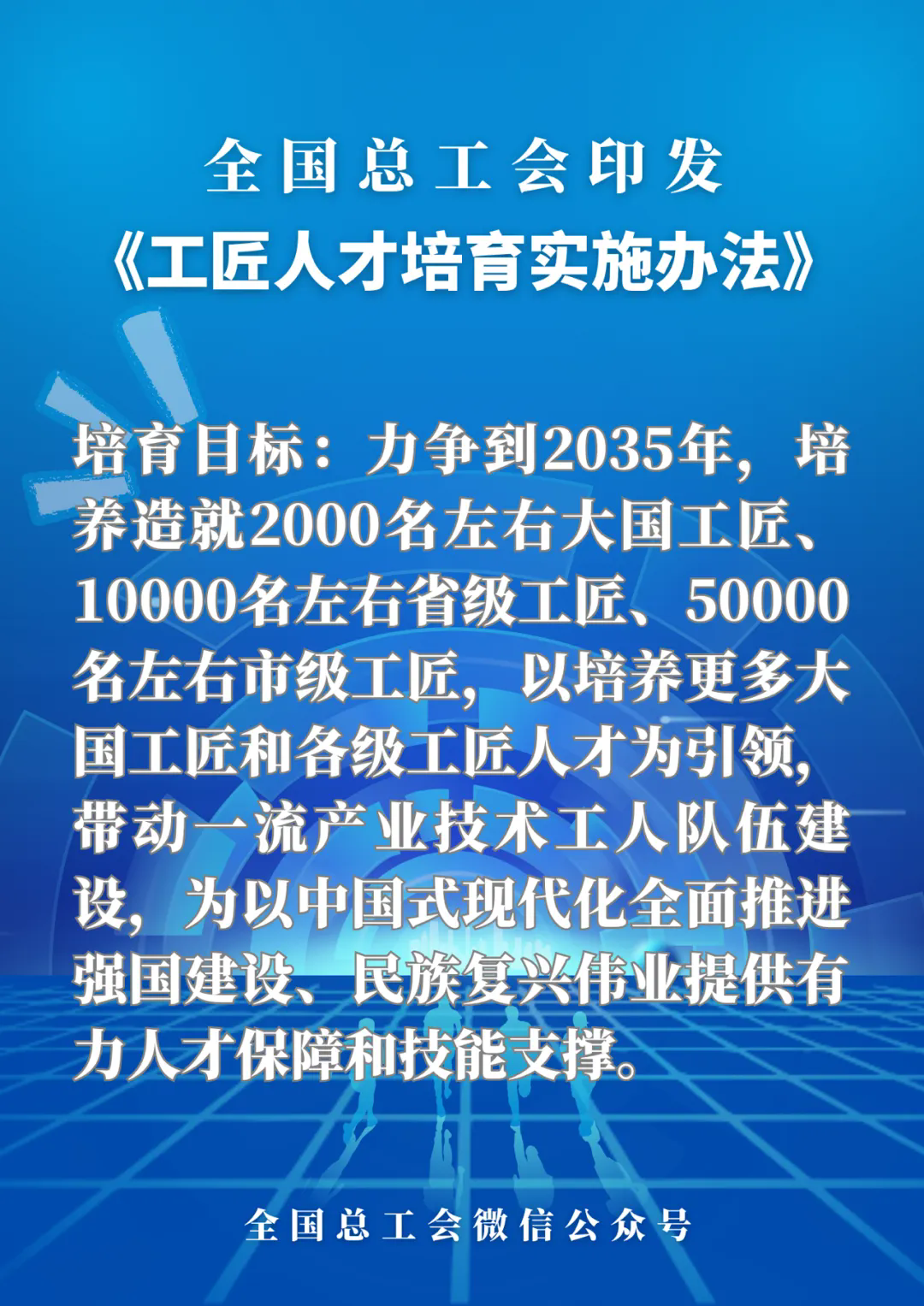 第二條 培育目標(biāo)是,力爭(zhēng)到2035年,培養(yǎng)造就2000名左右大國工匠、10000名左右省級(jí)工匠、50000名左右市級(jí)工匠,以培養(yǎng)更多大國工匠和各級(jí)工匠人才為引領(lǐng),帶動(dòng)一流產(chǎn)業(yè)技術(shù)工人隊(duì)伍建設(shè),為以中國式現(xiàn)代化全面推進(jìn)強(qiáng)國建設(shè)、民族復(fù)興偉業(yè)提供有力人才保障和技能支撐。