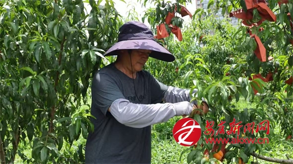 同樣迎來收獲的還有城關(guān)鎮(zhèn)的黃桃,在城關(guān)鎮(zhèn)龍嶺村的黃桃種植基地,連片的桃樹郁郁蔥蔥,金燦燦的黃桃壓彎了枝條,空氣中彌漫著誘人的桃香。基地負(fù)責(zé)人劉宏正忙著采摘,臉上洋溢著燦爛的笑容,他一邊采摘一邊介紹道:“我們這個桃園有金鳳黃桃、黃金黃桃、秋彤桃和冬桃四個品種,一共有9畝多,從6月中旬到10月左右,陸續(xù)都有成熟的桃子。”