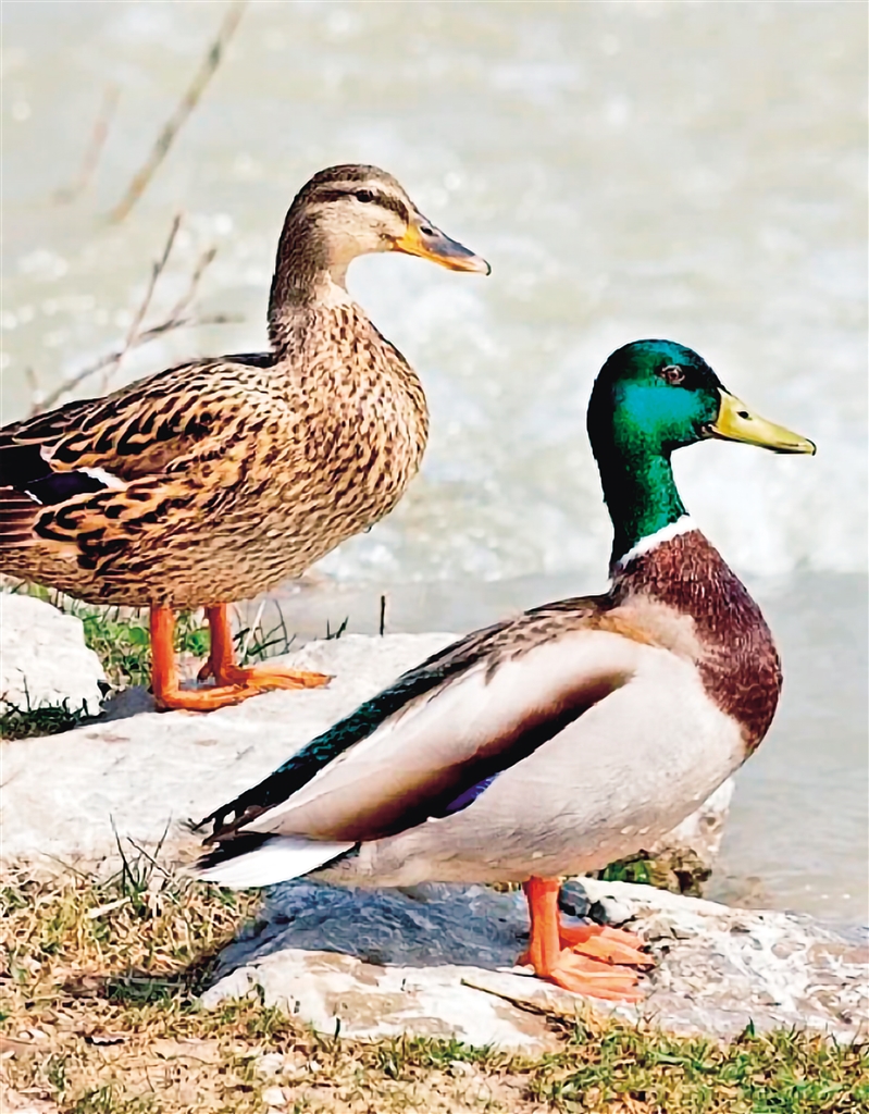 又名野鴨。雄鳥頭綠色,有一白色領(lǐng)環(huán),胸栗色,翼鏡藍(lán)綠色,尾上、下覆羽黑色,嘴黃綠色,腳橙紅色;雌鳥嘴橙黃色,貫眼紋黑褐色,全體褐色,有暗褐色斑紋。(來源:安康市林學(xué)會(huì))