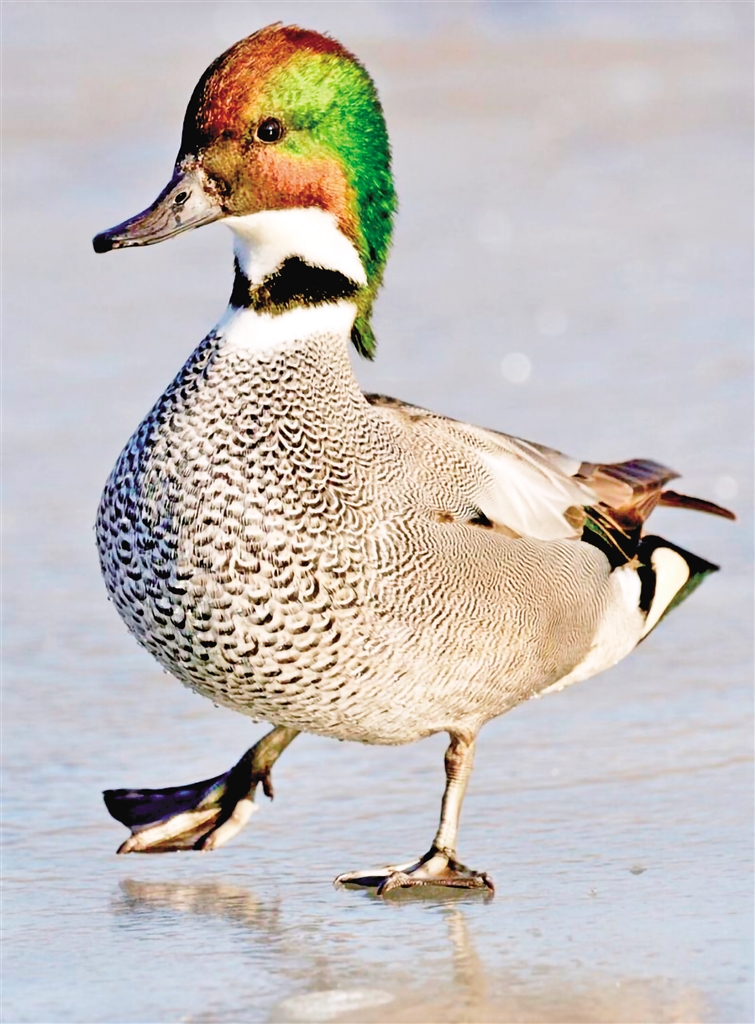 又名葭鳧、鐮刀鴨、扁頭鴨、早鴨、三鴨。雄鳥頭頂至后頸栗色,頭側(cè)及冠羽銅綠色;前頸基部有一黑色領(lǐng)環(huán),上體淺灰色,密布暗褐色波狀細(xì)紋;翼鏡綠黑色,三級(jí)飛羽延長(zhǎng)呈鐮狀;胸黑色密布白色新月形斑,尾下覆羽絨黑色;兩側(cè)具乳黃色斑塊,腋下白色;雌鳥體羽多黑褐色而具黃褐色羽緣,形成明顯的“V”形斑;虹膜褐色,嘴黑灰色,腳暗灰色。因胸、腹、脅部密布由大漸小的黑白波紋,排列成有序的特異圖案,形似編織物而故名。