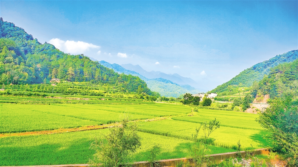 盛夏,旬陽市雙河鎮(zhèn)卷棚村,稻田、村莊、青山相映成趣,和美鄉(xiāng)村風(fēng)光如畫。潘文進 攝