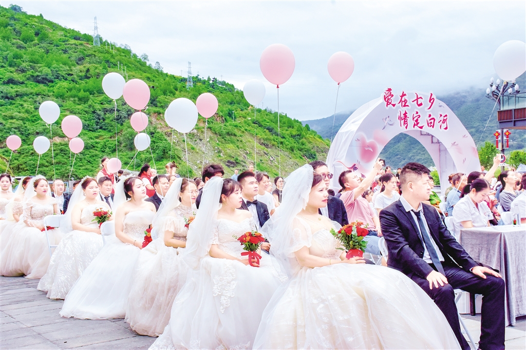 ?8月29日上午,“愛在七夕·情定白河”2025年白河縣新時代文明實踐集體婚禮主題活動在河街寶石文化廣場浪漫啟幕。來自各行各業(yè)的8對“珍珠婚”夫婦、8對新人齊聚一堂,通過分享婚姻保鮮秘訣、頒發(fā)結(jié)婚證、簽訂承諾書、開展婚姻家庭輔導(dǎo)等簡約而莊重的儀式,在各界代表和親朋好友的見證祝福下,開啟幸?;橐鲂缕?,用實際行動踐行婚事新辦、喜事儉辦的文明新風(fēng)尚。(紀(jì)道婭 攝)