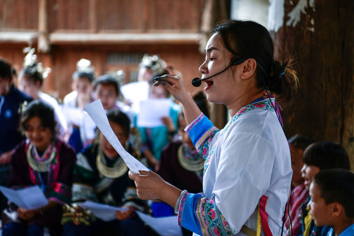 隨著國(guó)產(chǎn)動(dòng)畫(huà)電影《哪吒之魔童鬧海》不斷刷新中國(guó)影史票房紀(jì)錄,參與電影配樂(lè)的貴州省榕江縣三寶侗寨的楊想妮和“舞樂(lè)蟬歌”團(tuán)隊(duì)為更多人所熟知。樂(lè)團(tuán)成員懷揣“用音樂(lè)傳遞侗族文化,讓世界聽(tīng)見(jiàn)侗族大歌”的共同夢(mèng)想,將侗族大歌推向更廣闊的舞臺(tái)。這是2025年4月22日,楊想妮在貴州省黎平縣肇興鎮(zhèn)廈格侗寨教前來(lái)研學(xué)的孩子們唱侗歌。