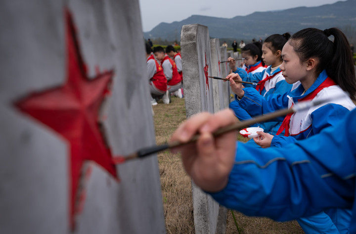 2025年3月31日,在四川川陜革命根據(jù)地紅軍烈士陵園,紅軍小學(xué)學(xué)生為無(wú)名烈士墓碑上的五角星描紅。當(dāng)日,來(lái)自四川通江縣的300名中小學(xué)青少年代表,齊聚川陜革命根據(jù)地紅軍烈士陵園,在莊嚴(yán)肅穆的儀式中開(kāi)啟了一堂“紀(jì)念碑下的思政課”,為埋葬在這里的25048名紅軍烈士寄去哀思。