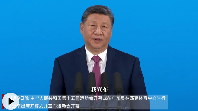 11月9日晚,中華人民共和國(guó)第十五屆運(yùn)動(dòng)會(huì)在廣東省廣州市隆重開幕。中共中央總書記、國(guó)家主席、中央軍委主席習(xí)近平出席開幕式并宣布運(yùn)動(dòng)會(huì)開幕。