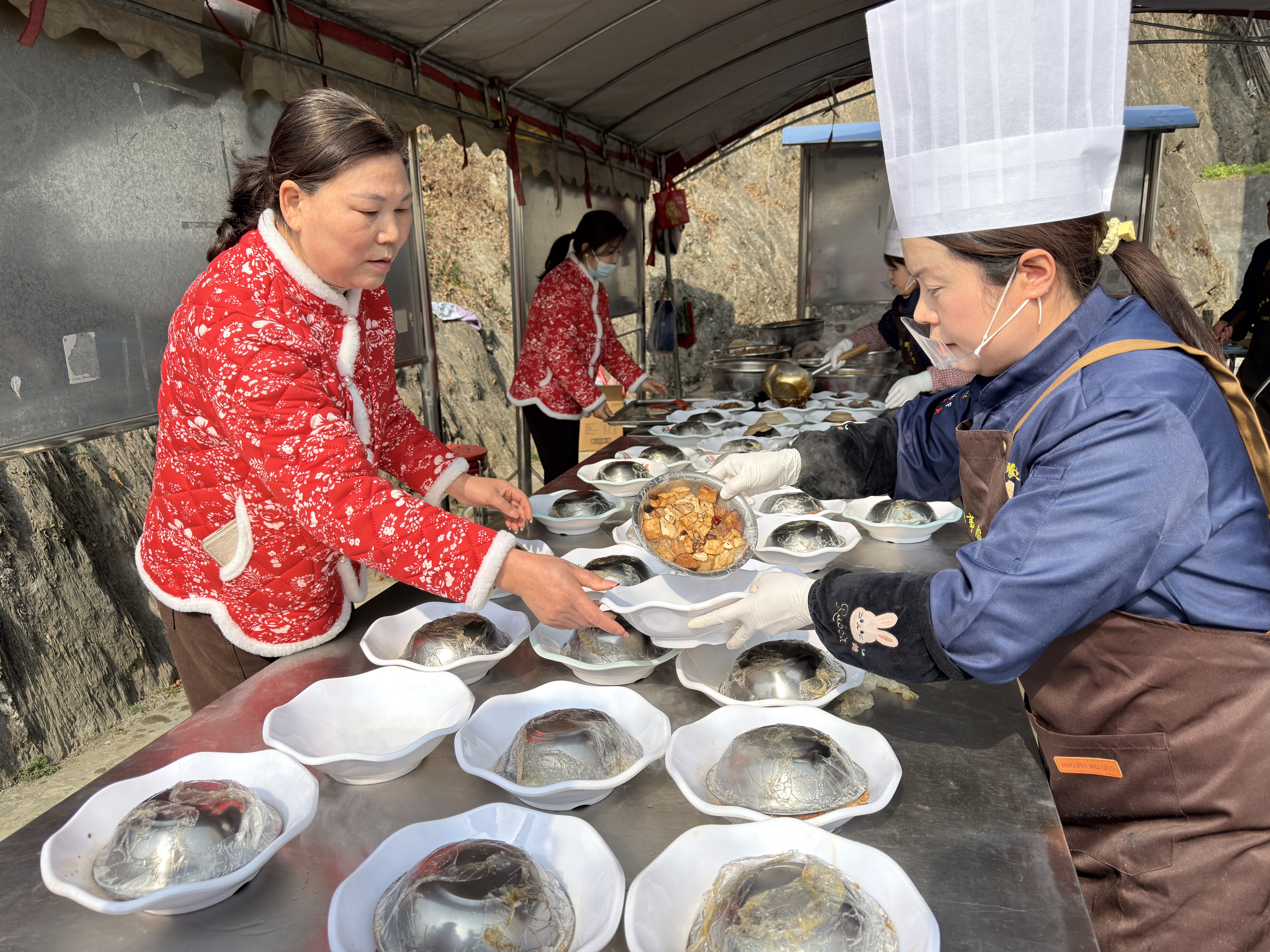 工作人員準(zhǔn)備特色美食“蒸碗”