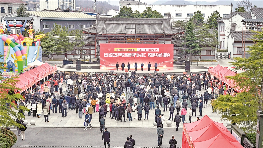 石泉縣2026年年貨節(jié)暨春季產(chǎn)業(yè)大招工·蘇陜勞務(wù)協(xié)作招聘會(huì)啟動(dòng)儀式近日在秦巴風(fēng)情園舉行。本次活動(dòng)創(chuàng)新融合“春風(fēng)行動(dòng)”招聘會(huì)、年貨節(jié)與文旅促銷(xiāo),吸引了縣內(nèi)外210余家重點(diǎn)企業(yè)參與,集中提供4500個(gè)優(yōu)質(zhì)崗位,旨在促進(jìn)就業(yè)與消費(fèi),助力縣域經(jīng)濟(jì)發(fā)展。(董長(zhǎng)松 攝)