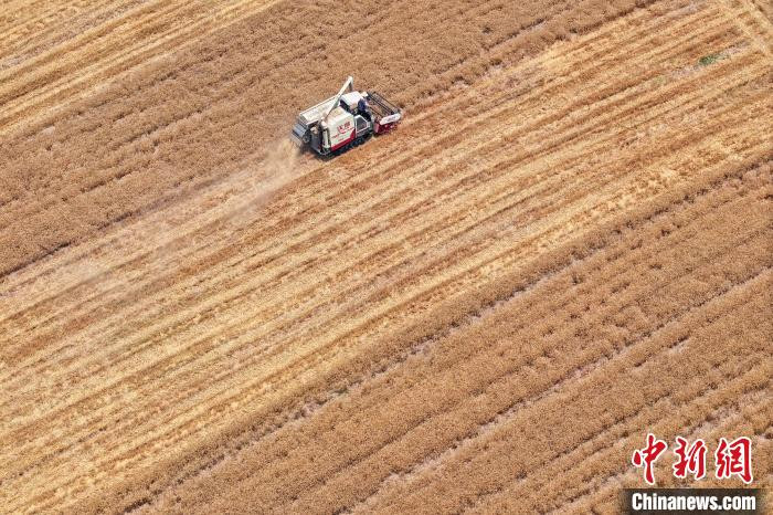資料圖:江蘇南京,工作人員駕駛農(nóng)機(jī)在江北一處田間收割小麥。(無人機(jī)照片)中新社記者 泱波 攝