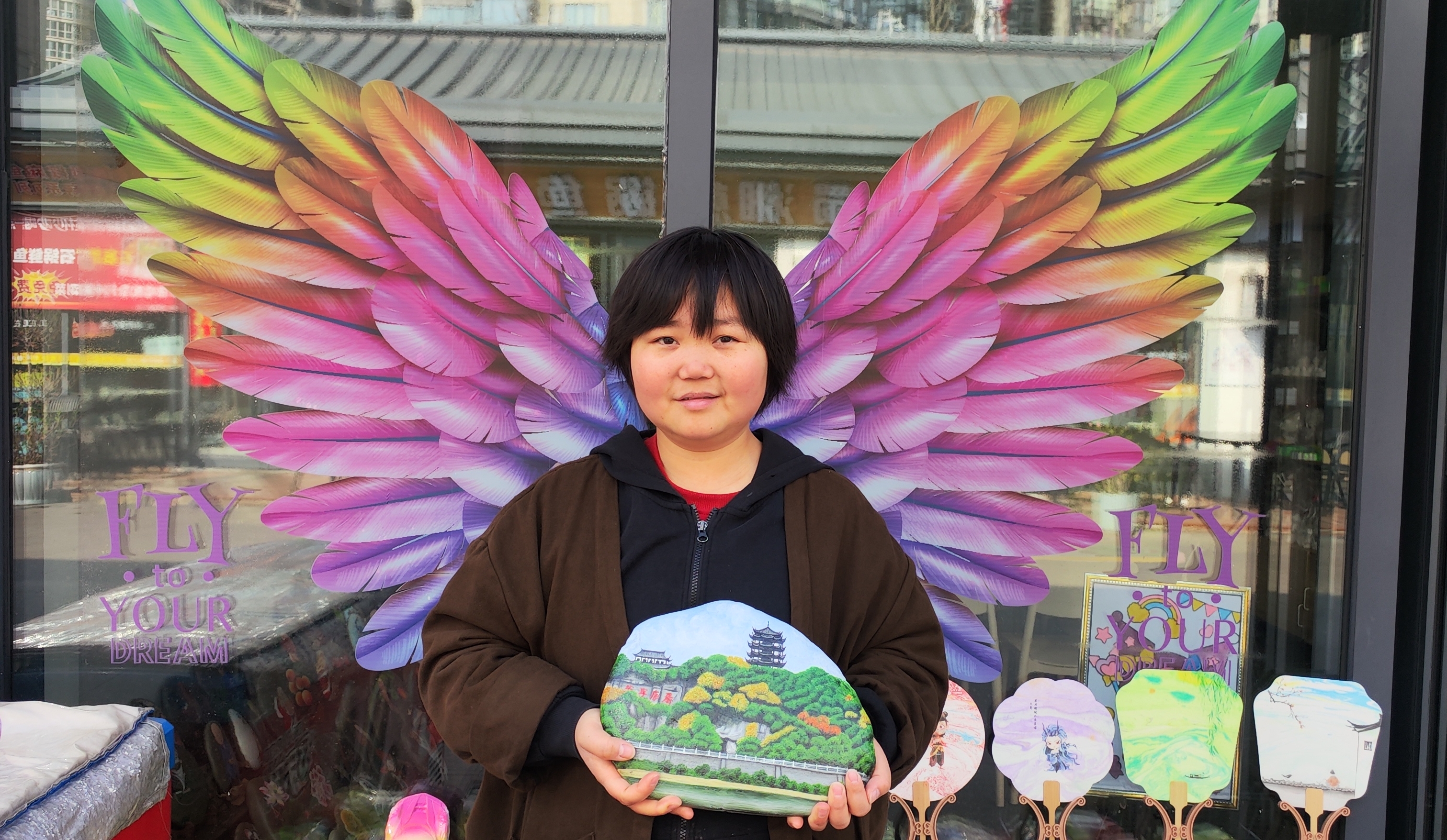 在她店鋪門口的玻璃柜上,貼著一雙展開的彩翼,手捧石頭畫的李景麗,眼神明亮、笑容溫婉,恰似破繭重生的蝴蝶,歷經風雨洗禮,依舊振翅翱翔,用手中的畫筆續(xù)寫著屬于自己的芳華,也用堅韌與熱愛,詮釋著新時代普通人不屈不撓、逐光前行的精神力量。