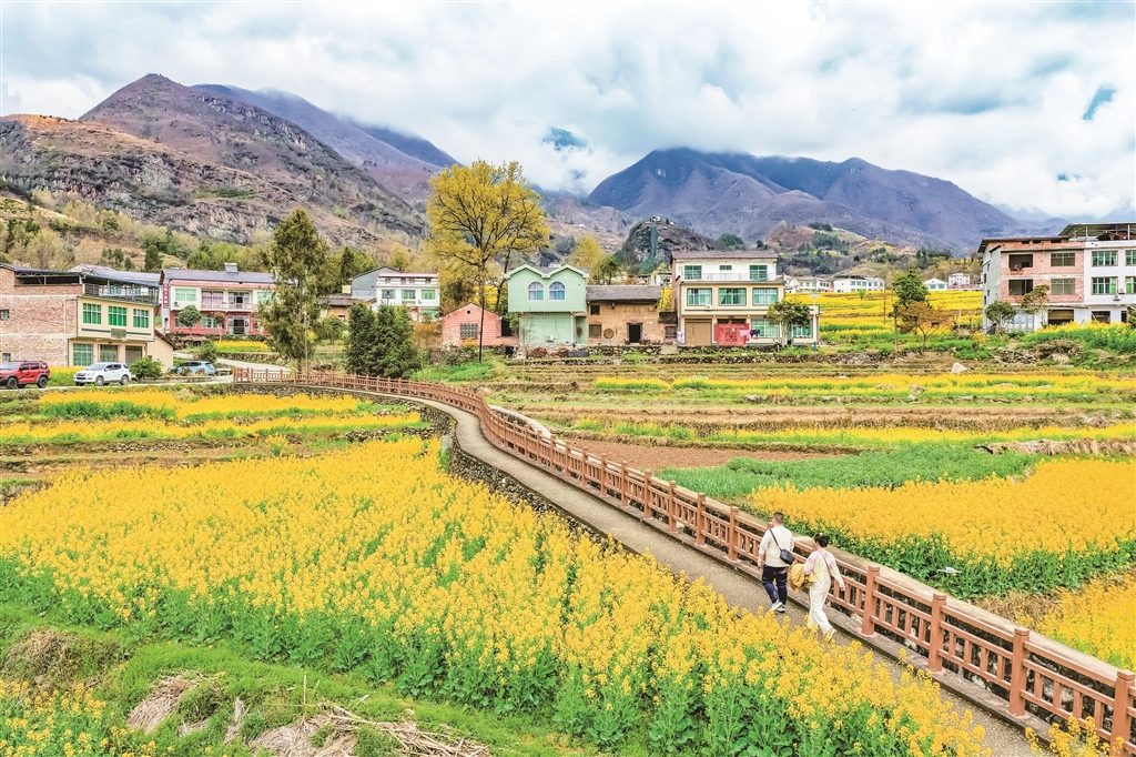 盛放的油菜花叢中,蜜蜂、蝴蝶翩翩起舞。