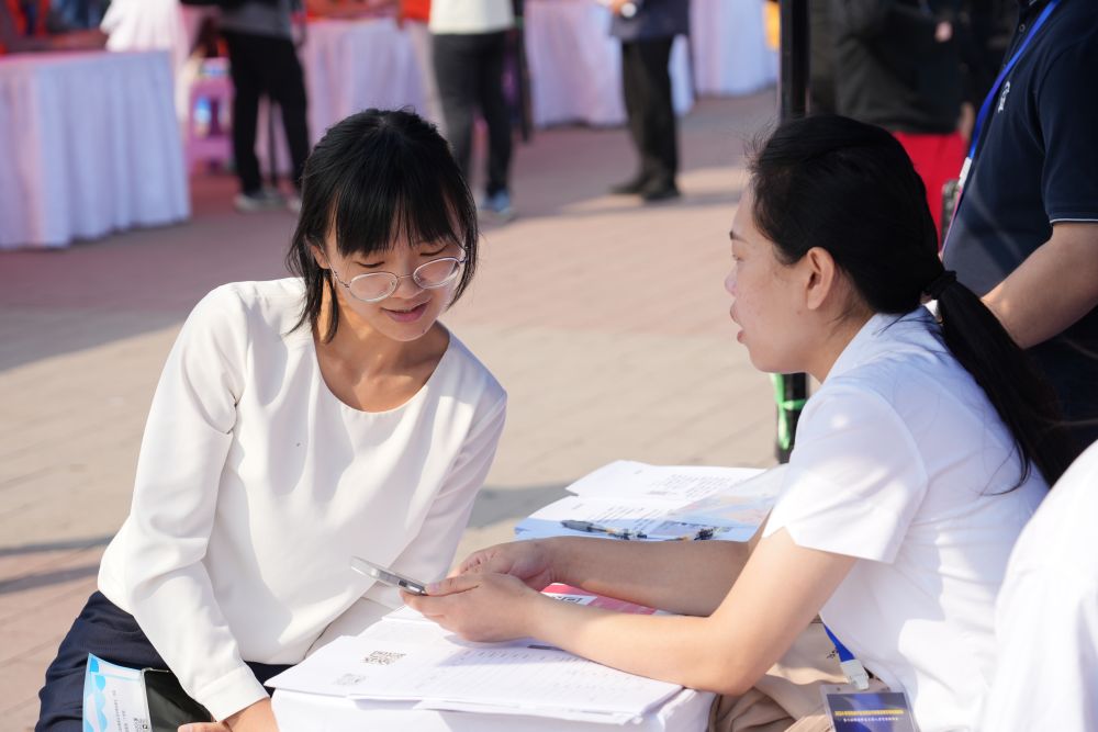 2024年9月25日,求職者(左)在招聘會現(xiàn)場與招聘單位工作人員交流。當(dāng)日,雄安新區(qū)舉辦2024年河北省畢業(yè)生就業(yè)市場雄安新區(qū)專場招聘會暨河北雄安新區(qū)大型人力資源招聘會。招聘會以“穩(wěn)崗就業(yè) 聚才發(fā)展”為主題,邀請京津冀地區(qū)共157家企業(yè)線下參會,提供就業(yè)崗位4783個。